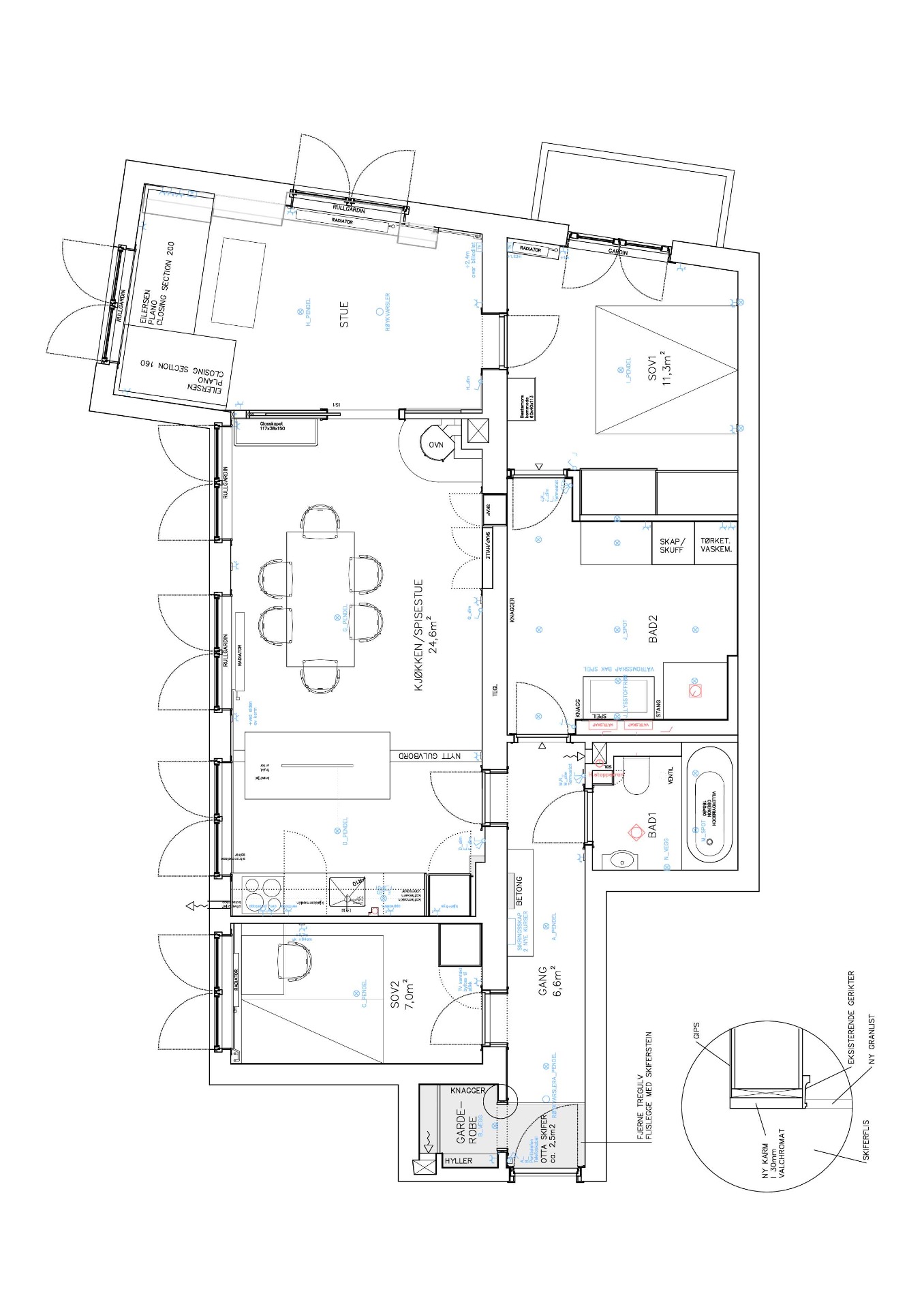 Ottar skiferflis er lagt i inngangspartiet og inn i garderoben. Ny innredning i garderoben.