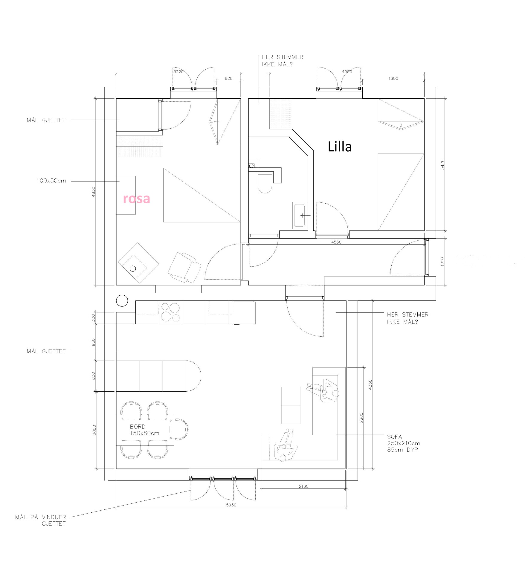Hovedsoverom i rosa. Det ble ønsket en varm valør. Valget sto mellom en blekere (NCS ) og en mer fargesterk rosa (NCS ). Byggherren valgte den mest fargesterke. Arkitekten ville ha valgt den blekere.