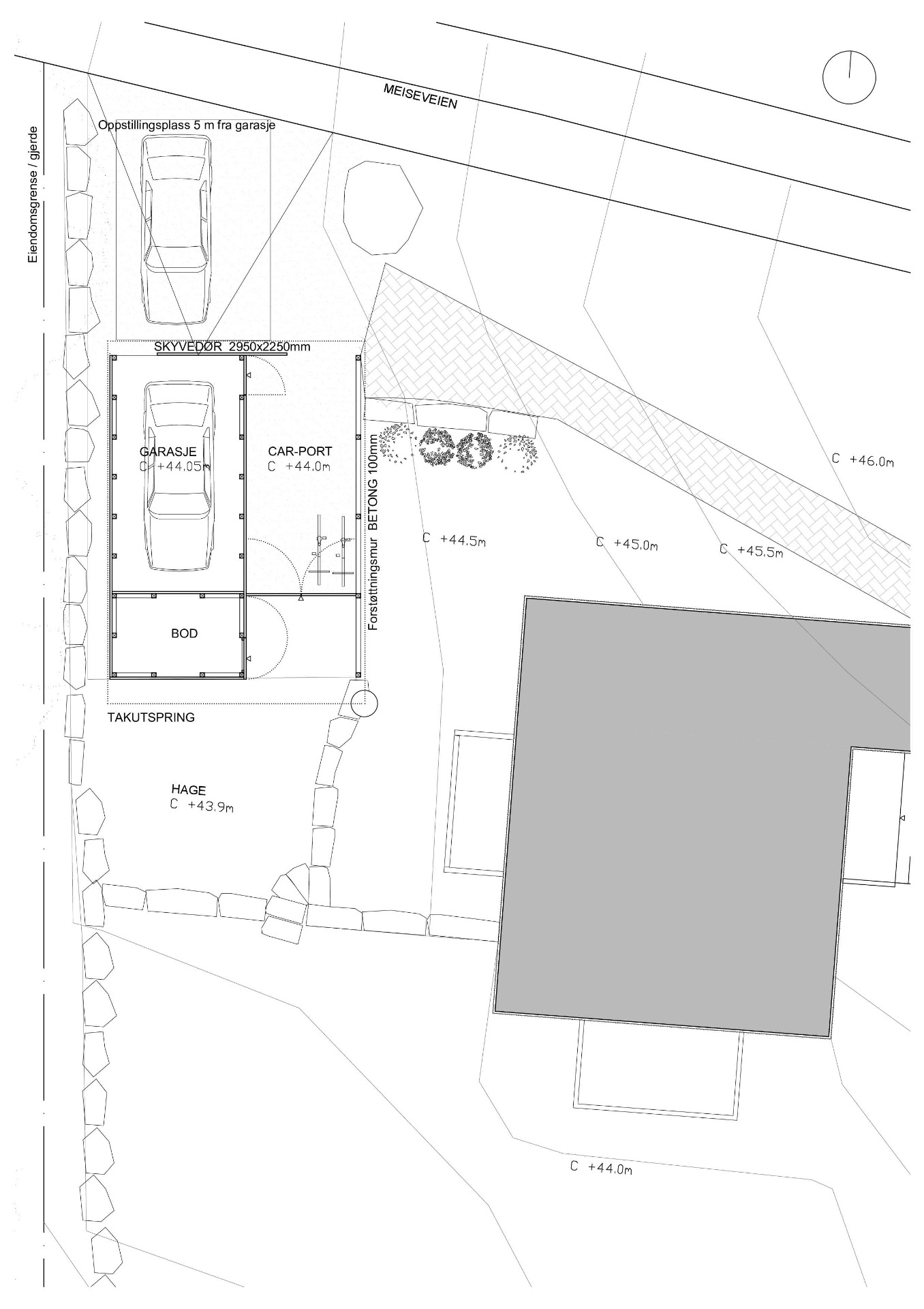 Foto viser garasjen slik den ble bygget. Arkitekten var ikke med på den løsningen. Men formen likner litt på forslaget.